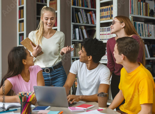 © Prostock-studio, Fototapeta premium Blonde girl sharing her ideas about project upgrade