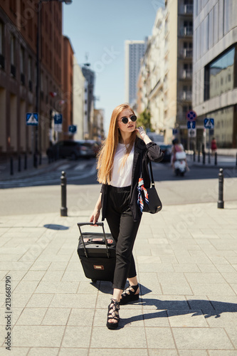 Fototapeta premium Blonde girl walking on the street with suitcase