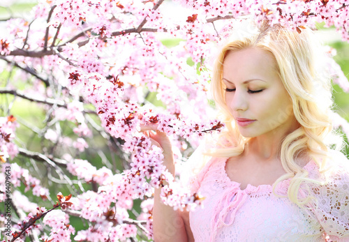 © Guzel Studio, Fototapeta premium Blonde Girl with Cherry Blossom. Spring Portrait.