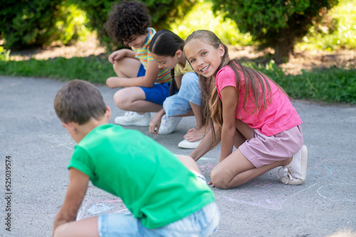 Obraz premium Blonde girl with friends drawing with crayons in park