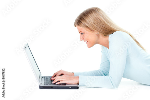 © djoronimo, Naklejka premium Blonde girl working on laptop, white background