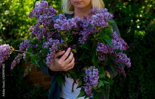 © Dominika, Obraz premium Blonde hair woman in dress posing with bouquet of lilac flowers over white background. Lilac flower in a female hands.