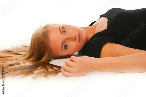 © latinist, Obraz premium Blonde in a black dress lays on a white background
