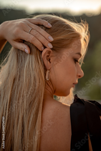 Fototapeta premium Blonde long hair, nature summer happy adult girl with long blond hair...