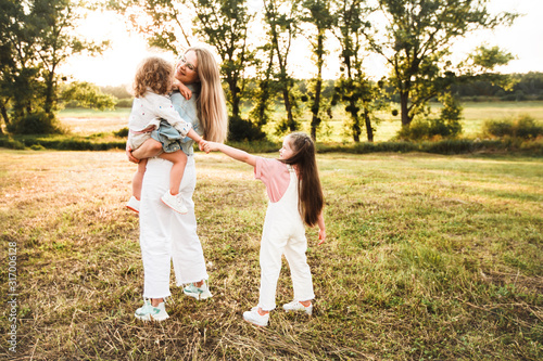 Obraz premium Blonde mother with two cute daughters are walking and having fun outdoors....