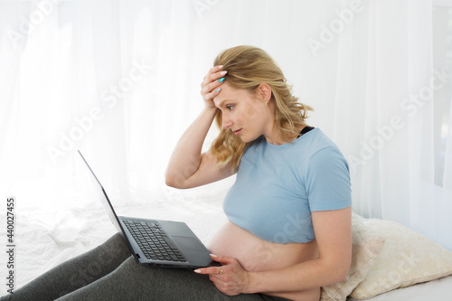© Irina, Fototapeta premium Blonde pregnant woman working on a computer, surprised, upset, holding her head with her hand online shopping