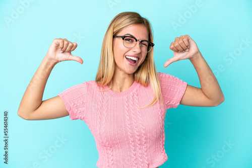 Fototapeta premium Blonde Uruguayan girl isolated on blue background proud and self-satisfied