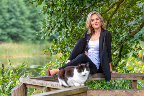 © ako-photography, Obraz premium blonde woman and cat siting on a railing wooden walkway above the pound