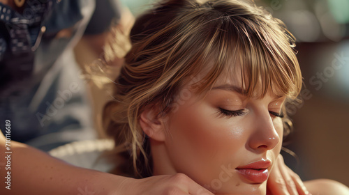 © kora studio, Fototapeta premium blonde woman gets head massage in the spa