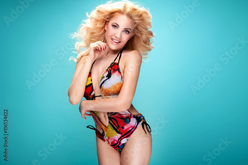 © neonshot, Naklejka premium Blonde woman in fashionable swimsuit.