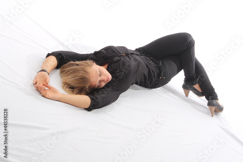 © Rubi Halfon, Fototapeta premium Blonde woman lying on white floor