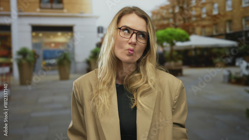© Krakenimages.com, Fototapeta premium Blonde woman making funny faces on a city street, wearing glasses and a beige jacket, with urban scenery in the background, showing a playful and cheerful attitude.