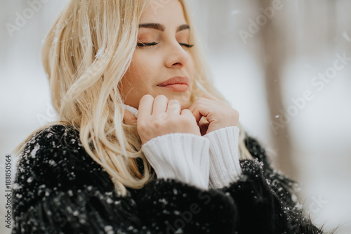 © BGStock72, Naklejka premium Blonde woman outside in snow winter coat
