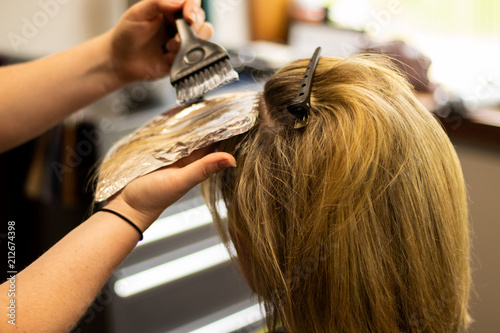 © Ben, Fototapeta premium Blonde woman receiving haircut at a salon. Woman with blonde highlights. Hair foils on a female client. Master stylist cutting hair