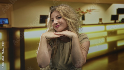 © Krakenimages.com, Fototapeta premium Blonde woman resting chin on hands in hotel lobby smiling at camera with soft golden lighting and reception desk visible; confidence.