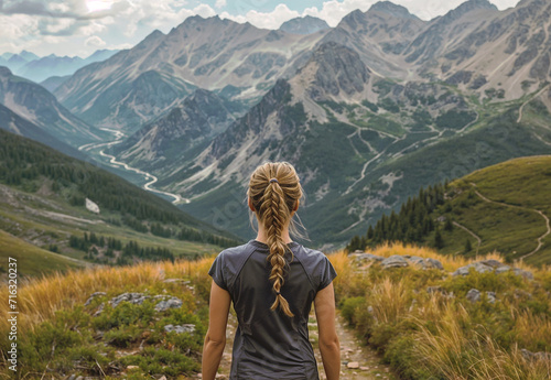 © Deea Journey , Naklejka premium Blonde woman seen from behind, hiking on a beautiful sunny summer day, mountains in the background