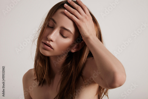 © Anastasia, Fototapeta premium blonde woman touching her head. head ache concept