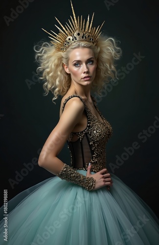 © miss irine, Naklejka premium Blonde woman wears gold crown and beaded gown. She poses with elegant flair in a studio setting. Her pose suggests royalty and fairy tale enchantment, creating a majestic atmosphere.
