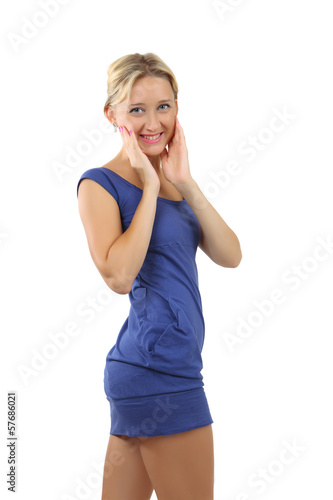 Fototapeta premium Blonde woman, 34 years old, in a short blue dress.