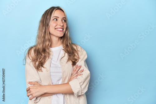 © Asier, Naklejka premium Blonde young caucasian woman in blue studio smiling confident with crossed arms.