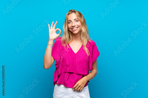 Fototapeta premium Blonde young woman over isolated blue background showing ok sign with fingers