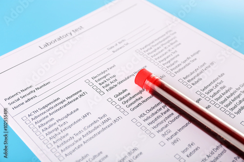 © Africa Studio, Obraz premium Blood in test tubes and investigation form on the table