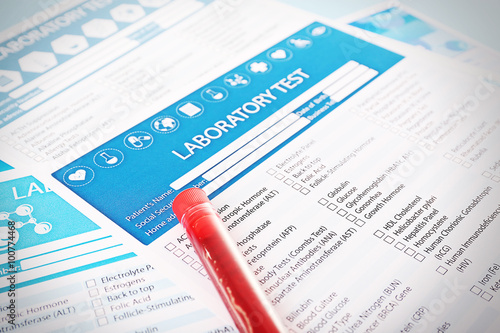 © Africa Studio, Obraz premium Blood in test tubes and investigation form on the table, close-up