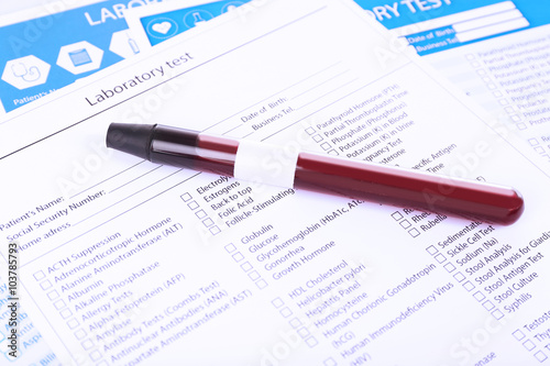 © Africa Studio, Obraz premium Blood in test tubes and investigation form on the table, close-up