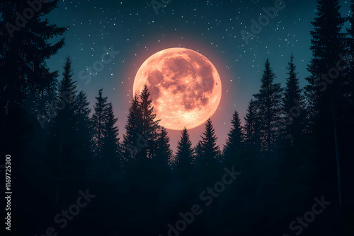 © AgungRikhi, Fototapeta premium Blood moon rising over a dark forest at night.