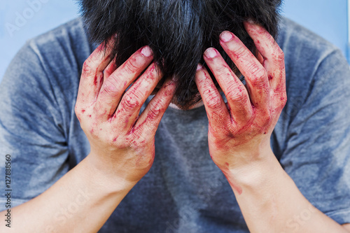 © zoneteen, Fototapeta premium Bloody theme lone murderer: the murderer shows bloody hands and
