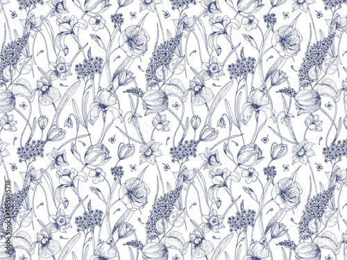 Obraz premium Bloom. Vintage floral seamless pattern. Spring flowers. Blue and white....