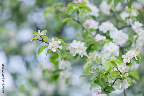 Obraz premium Blooming apple tree branch. Blurred background. Closeup, selective focus.