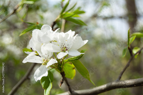 © ilona_yank, Fototapeta premium Blooming apple tree in spring time with white and pink flowers and bee
