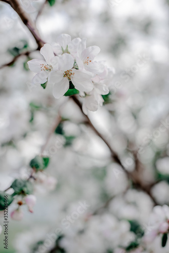 © Anna, Obraz premium Blooming apple tree in the garden, white flowers on a green background