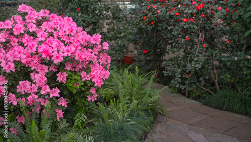 Naklejka premium Blooming azalia bushes in the greenhouse