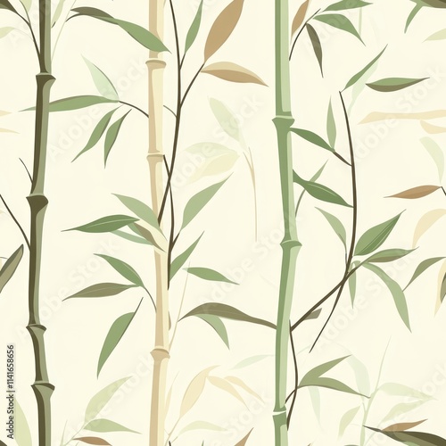 Naklejka premium Blooming Bamboo Bliss A seamless 2D pattern featuring minimalist bamboo stalks and leaves in soft greens and browns