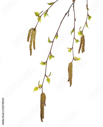 © dule964, Naklejka premium Blooming birch in spring, branch with leaves and seeds isolated on white background