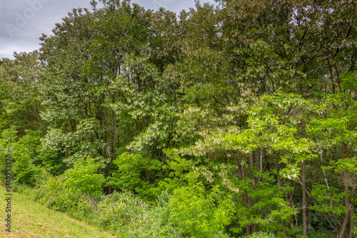 © Sarolta Nagy, Fototapeta premium blooming black locust tree in forest edge