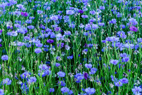 © Zigmunds, Naklejka premium blooming blue cornflower in the garden on a blurred background