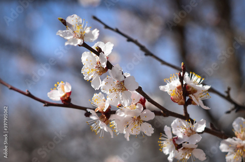Obraz premium Blooming branch of apricot tree on a sunny day.