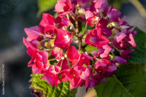 © Marina Gordejeva, Obraz premium blooming bush of hydrangea macrophylla red baron. flowers close-up