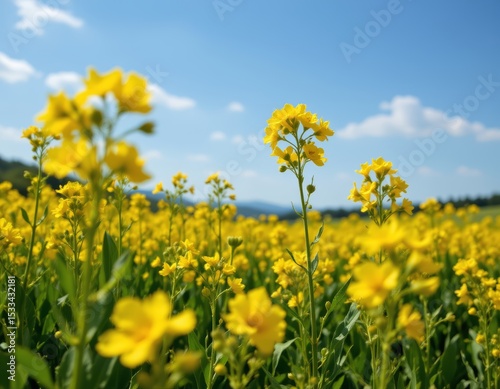 Fototapeta premium Blooming Canola Field Under Blue Sky