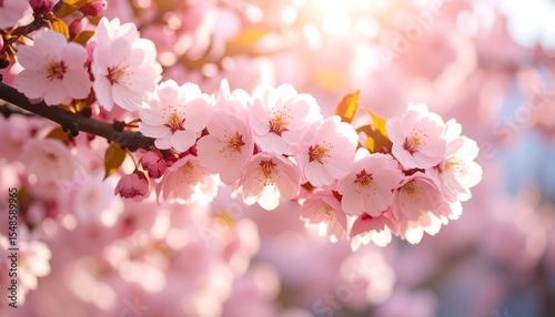 Obraz premium Blooming Cherry Blossom Branch with Springtime Beauty with Soft Sunlight, and...
