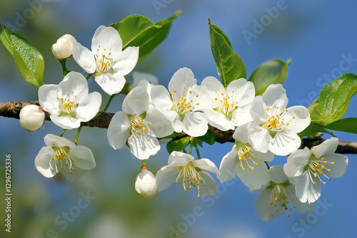 © Denis, Obraz premium Blooming cherry blossom on tree branches, spring season concept close up detail background.