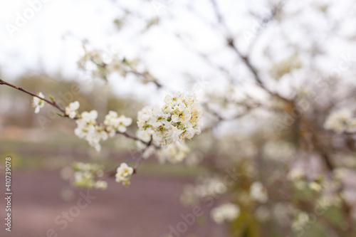 © Tatsiana, Obraz premium Blooming cherry blossoms close-up. Spring joyous mood.