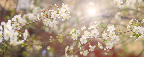 © sandipruel, Obraz premium Blooming cherry branch in spring garden at wedding ceremony.