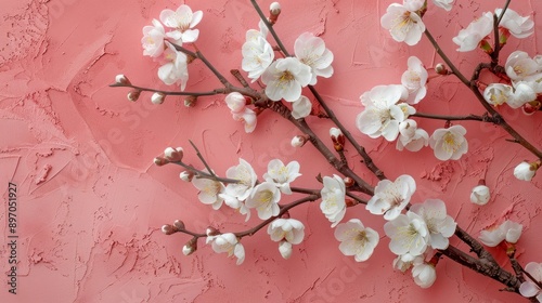 © Anastasiia, Obraz premium Blooming Cherry Branch on Pink Background