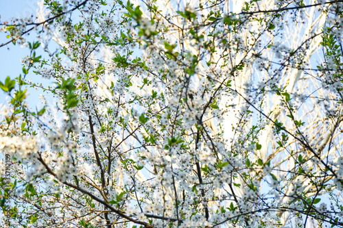 Fototapeta premium Blooming cherry branch, white flowers, close-up.