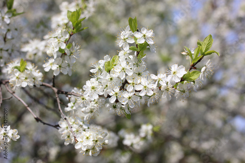Fototapeta premium blooming cherry or plum branch with white inflorescences