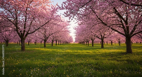 © ms25designs, Obraz premium Blooming Cherry Orchard: A Springtime Symphony of Pink and Green